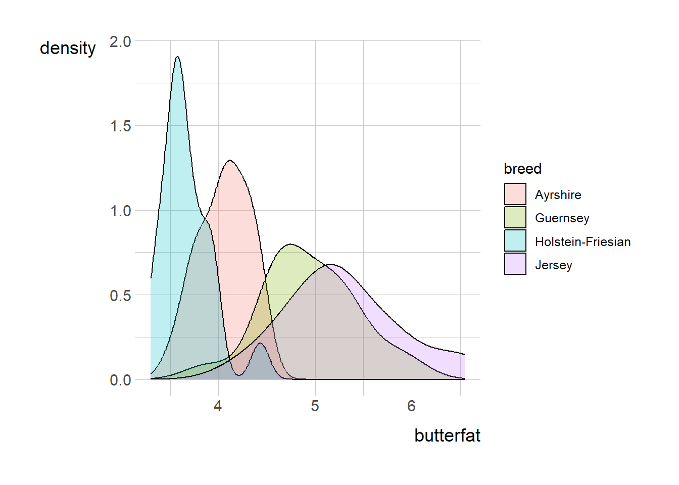ggplot(cows_filtered, aes(x=butterfat, fill=breed)) + geom_density(alpha=0.25)