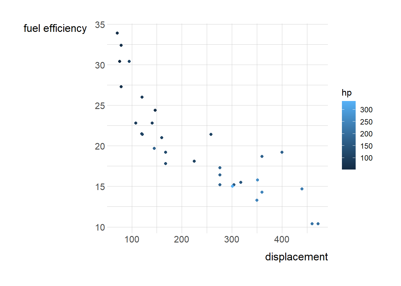 c<- ggplot(cars, aes(disp, mpg)) +