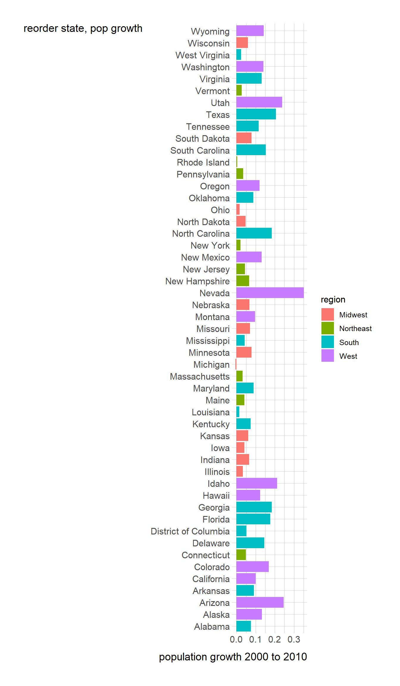 pg + labs(y= "population growth 2000 to 2010")+ labs(x= "reorder state, pop growth")