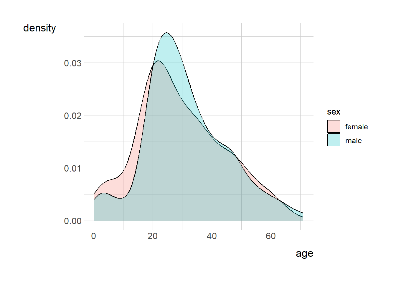 ggplot(titanic, aes(x=age, fill=sex)) + geom_density(alpha=0.25)